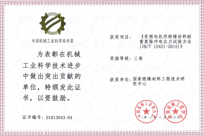 由中國(guó)機(jī)械工業(yè)聯(lián)合會(huì)和中國(guó)機(jī)械工程學(xué)會(huì)共同設(shè)立“中國(guó)機(jī)械工業(yè)科學(xué)技術(shù)獎(jiǎng)”,是中國(guó)機(jī)械領(lǐng)域最具權(quán)威的獎(jiǎng)項(xiàng)之一。近日,2018年度中國(guó)機(jī)械工業(yè)科學(xué)技術(shù)獎(jiǎng)獲獎(jiǎng)項(xiàng)目公布,我公司(國(guó)家絕緣材料工程技術(shù)研究中心)參與制定的行業(yè)標(biāo)準(zhǔn)JB/T12421-2015《變頻電機(jī)用絕緣材料耐重復(fù)脈沖電應(yīng)力試驗(yàn)方法》榮獲 “中國(guó)機(jī)械工業(yè)科學(xué)技術(shù)獎(jiǎng)” 三等獎(jiǎng)。此次獲獎(jiǎng)?wù)f明公司一如既往的發(fā)揮著行業(yè)示范帶頭作用,爭(zhēng)先擁有規(guī)則的話語(yǔ)權(quán),為公司提高核心競(jìng)爭(zhēng)力和產(chǎn)品創(chuàng)新能力提供了助力。